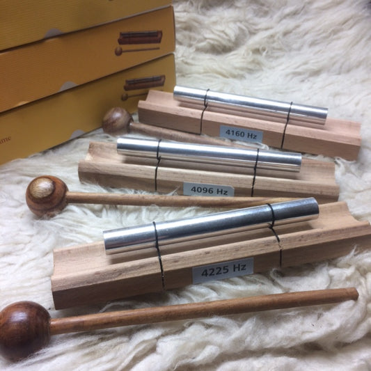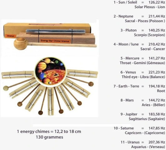 Sélection d'energy chimes/ barres sonores, set de 11 barres 'Fréquences des planÚtes' ! 12,2 à 18 centimÚtres de longueur, vendu avec maillet. Parfait pour la Méditation, soins, bains de sons...
