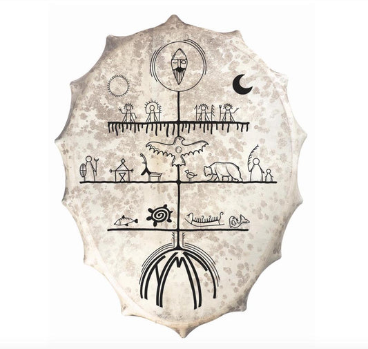 Tambour Chamanique fait par les Indiens, la 'Tribu de la terre' au Québec, en peau de Orignal, Ø 40 centimètres. Vendu avec maillet !