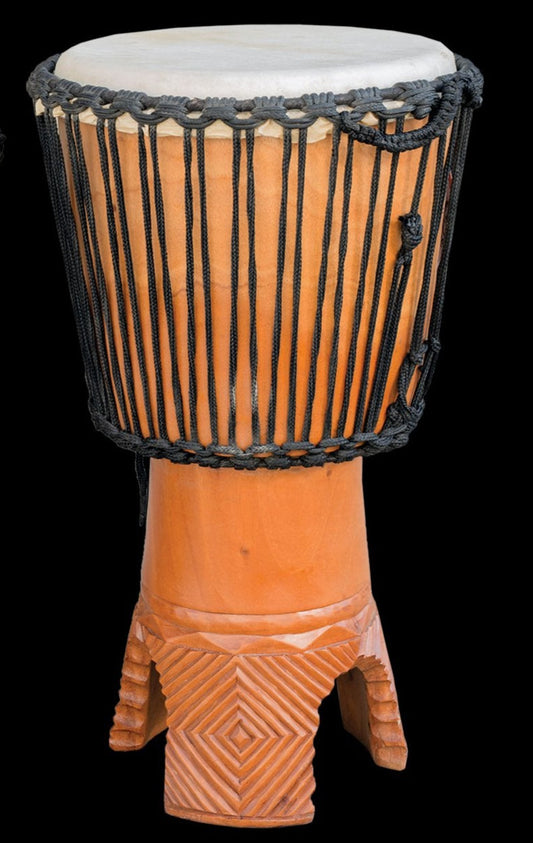 Djembé sculpté spécial basse, en bois d’acajou et peau de chèvre, au souffle profond et vibrant grâce à son anneau bass reflex !