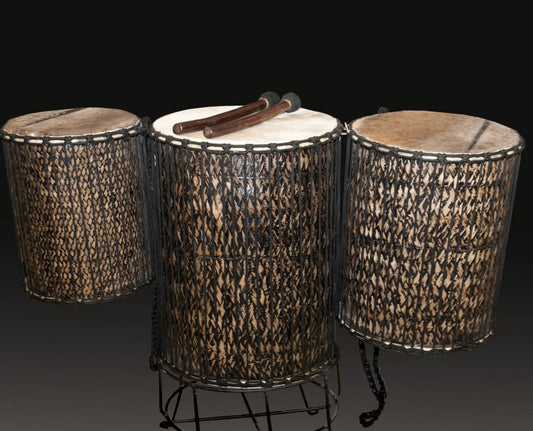 Doun Doun en peau de chèvre sur fûts en bambou, vendu entier ou en 3 parties, livré avec baguette et support en métal, superbe composition rythmique ! Le son est plus chaud que sa version qu'en peau de vache ! 60x45cm, 50x40cm, 40x35cm !