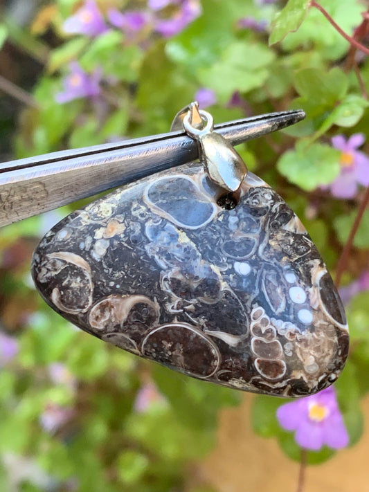 Agate turitelle/ fossile, pendentif de 36mm de hauteur x 36 de largeur x 11 d'épaisseur. Vendu avec cordon réglable de couleur noire !