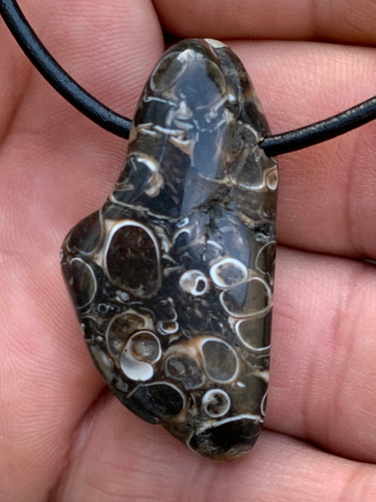 Agate turitelle/ fossile, pendentif de 42mm de hauteur x 22 de largeur x 11 d'épaisseur. Vendu avec cordon réglable de couleur noire !