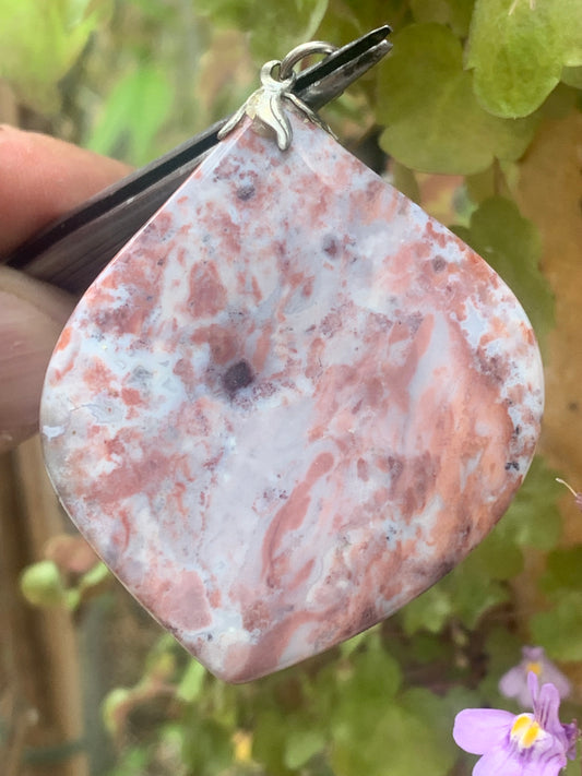 Agate rose, pendentif de type 'tranche naturelle polie' de 60 millimètres de hauteur x 45 mm de largeur x 5 millimètres. Vendu avec cordon noir réglable offert !