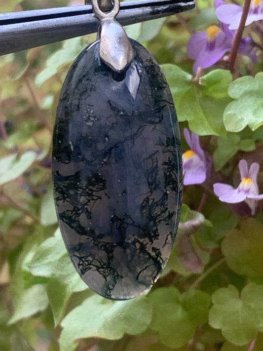 Agate mousse, pendentif en Argent de 30mm de hauteur x19 de largeur x6 d'épaisseur. Vendu avec cordon réglable !