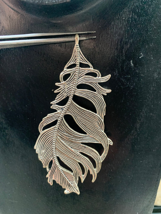Pendentif en métal argenté en forme de plume. De 85 x 40 x 5 millimètres. Vendu avec cordon noir réglable offert, parfait !