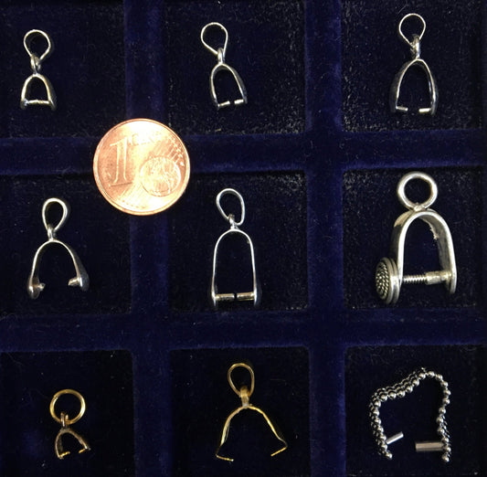 Sélection de bélières pour pierres percées (cabochons, perles...). De 5 à 15 millimètres... Très bonne qualité, parfait pour adapter vos pierres préférées ! Finition Argent, doré ou argenté !