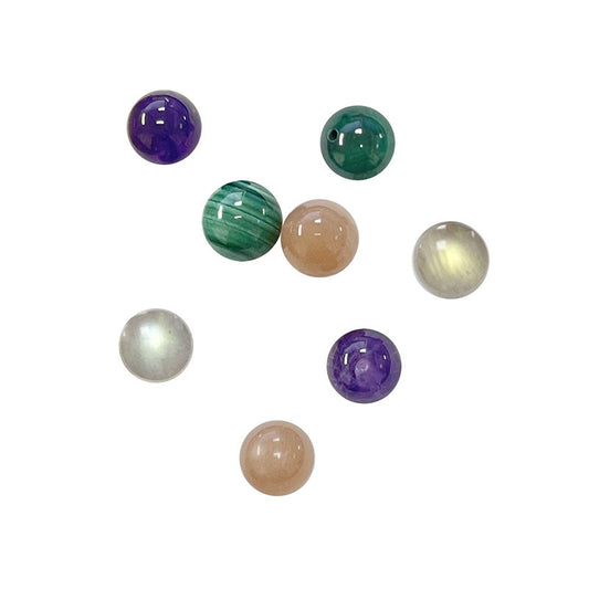 Perles 'rondes' de 8 millimètres 'semi-percées', pour création de puces/clous/ boucles d'oreilles. Conditionnement par lot de 8 pièces : 2 Améthyste - 2 Malachite - 2 Pierre de soleil -2 Labradorite