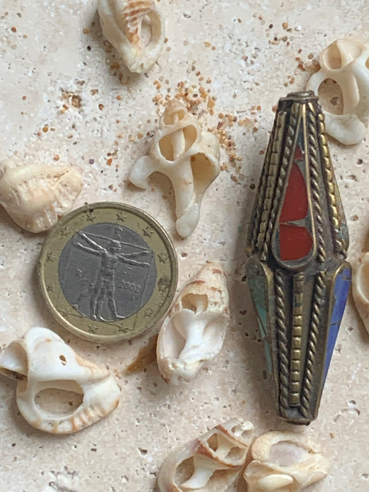 Turquoise, corail et lapis lazuli sertis sur perle/ pendentif en métal argenté de type laiton. 55 millimètres de hauteur x 15 de diamètre. Vendu avec cordon noir réglable offert ! Parfait pour être porter ou pour création !