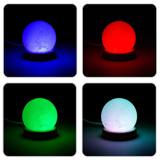 Lampe en sel à prise USB - 4 couleurs changeantes - En forme de sphère sur socle en bois d'acacia. Provenance : Inde. 9 cm - 450 gr.
