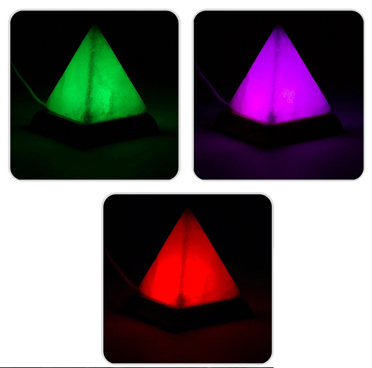 Lampe en sel à prise USB - 4 couleurs changeantes - En forme de pyramide sur socle en bois d'acacia. Provenance : Inde. 9 cm - 400 gr.