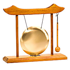 Gong de table de 24x22 cm, avec une structure de bois foncé, disque doré et heurtoir dans un élégant style orientale.