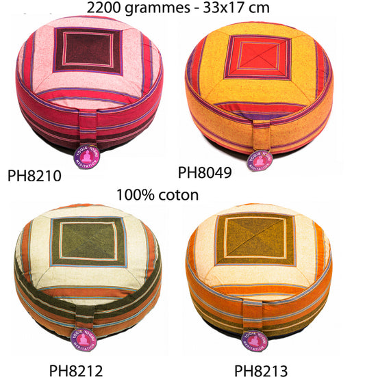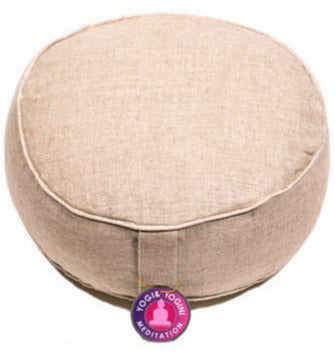 Coussin de yoga ou de mĂ©ditation en chanvre â 33 cm de diamĂštre Ă 11 cm de hauteur, housse extĂ©rieure en coton aux couleurs variĂ©es, remplissage en cosses de sarrasin !