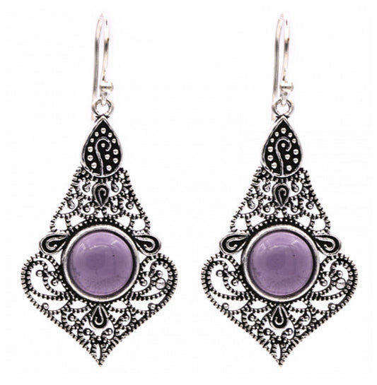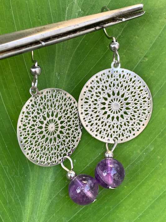 Boucles d'oreilles en Améthyste avec un superbe Mandala en Argent où est suspendue une perle ronde, qualité AA à AAA. Finition Argent 925 !