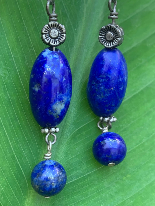 Boucles d'oreilles en Lapis lazuli, perlages sur tiges avec fantaisies, qualité AA à AAA. Vendu en finition Argent ou laiton argenté, parfait !