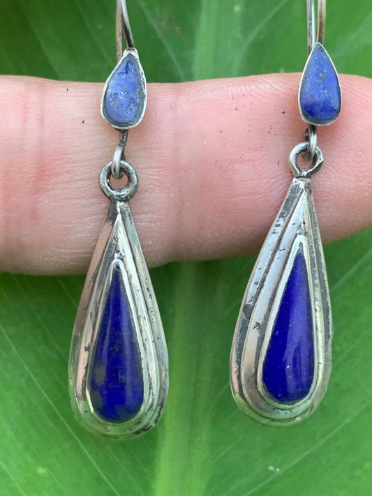 Boucles d'oreilles en Lapis lazuli, cabochons sertis en formes de 'goutte', qualité AA à AAA. Vendu en finition Argent, parfait !