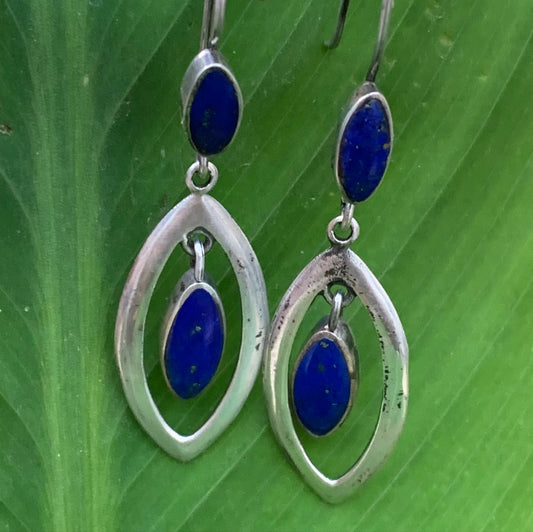 Boucles d'oreilles en Lapis lazuli, cabochons sertis en formes de 'triangle navette', qualité AA à AAA. Finition Argent !