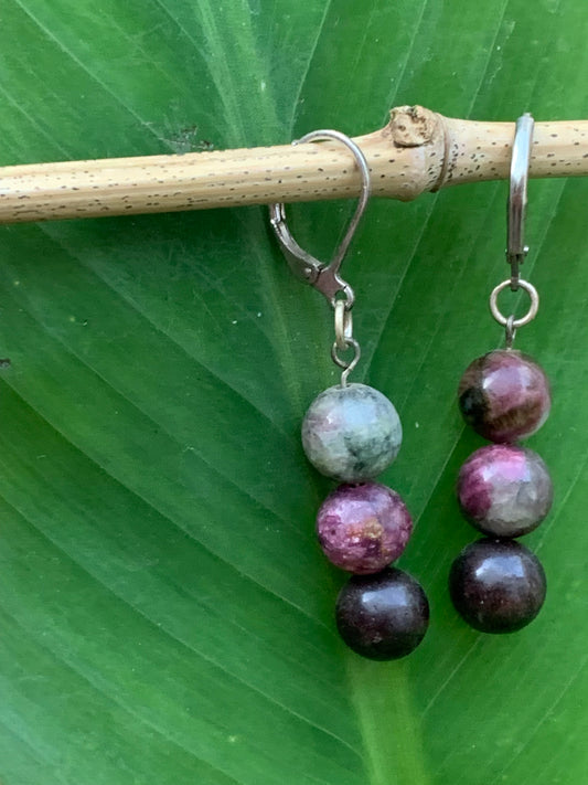 Boucles d'oreilles en Tourmaline rose (Rubellite), 3 perles de 8mm sur tige, qualité AA à AAA. Vendu en Argent ou en laiton finition argenté ou doré, parfait !