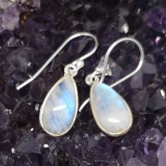 Boucles d'oreilles en Labradorite blanche (Péristérite), cabochon sertis de formes rondes, qualité AA à AAA. Vendu en finition Argent, parfait !