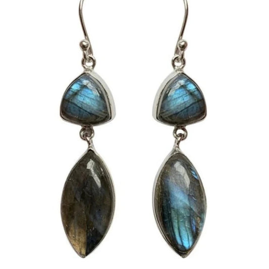 Boucles d'oreilles en Labradorite, cabochon sertis en formes de 'triangle navette', qualité AA à AAA. Vendu en finition Argent, parfait !