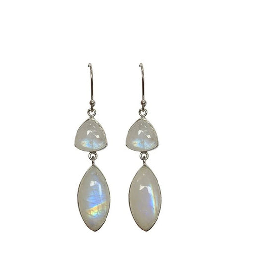 Boucles d'oreilles en Pierre de lune, cabochon sertis en formes de 'triangle navette', qualité AA à AAA. Vendu en finition Argent, parfait !