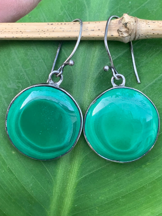 Boucles d'oreilles en Malachite, cabochons de 25mm sertis Argent 0.925, superbes pièces de qualité AA à AAA, parfait !