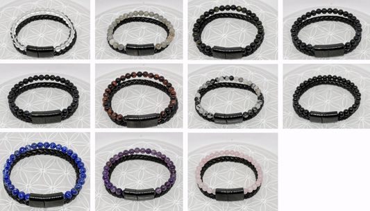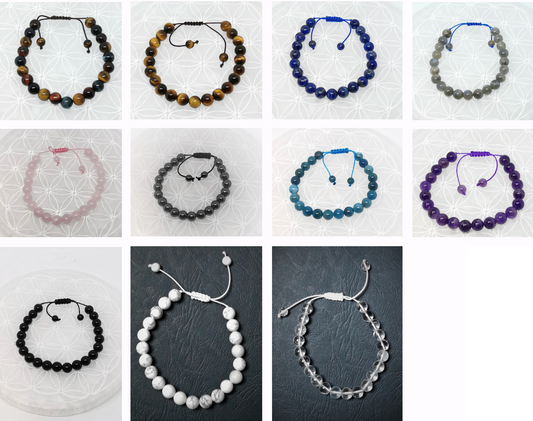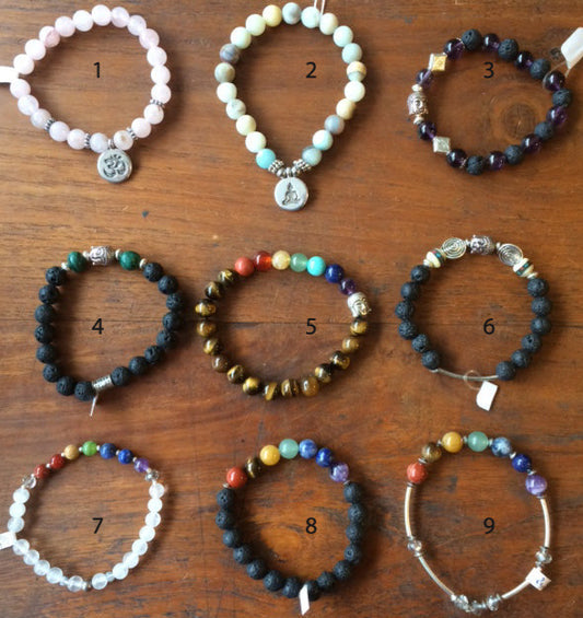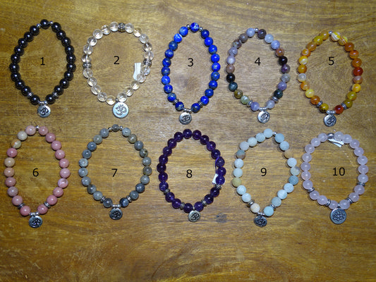 Collection de bracelets 7 chakras ou avec 'Charms' avec perles de 8 mm. Disponible de 17 à 21 cn de longueur. Qualité AA à AAA !