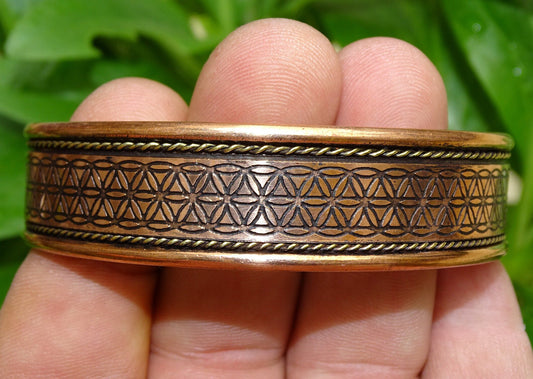 Bracelet magnétique 'manchette' en cuivre 2 cm, gravure Fleur de Vie, avec 6 aimants agissant sur les méridiens !