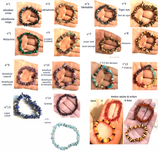Page 10 : Mix œil de tigre, Onyx, Opale boulder, Opale jaune, Opale rose, Opale verte, Bois ébène, Palissandre, Santal, Palo santo, Péridot, Perle Biwa, Perle de culture, Pierre de lave, Pierre de lune blanche, Mix pierre de lune et soleil,