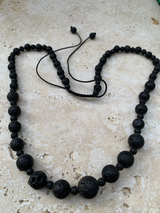 Pierre de lave, 'collier/ chute de perle', de forme ronde de 4 à 10 mm -50 cm. Fermeture coullissante. très belle pièce !