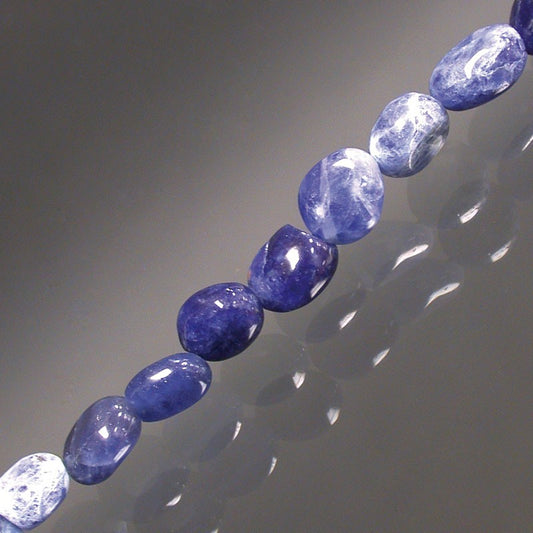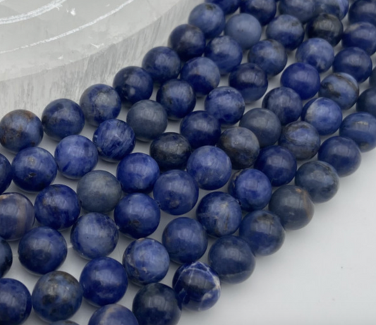 Sodalite qualité Extra, perles rondes de 6 et 8 mm, vendu en : fil de perle 38/39 cm, en bracelet de 17 à 21cm, en collier de 45 ou sautoir de 60cm. Qualité AA à AAA, superbes perles d'un bleu naturel envoûtant !