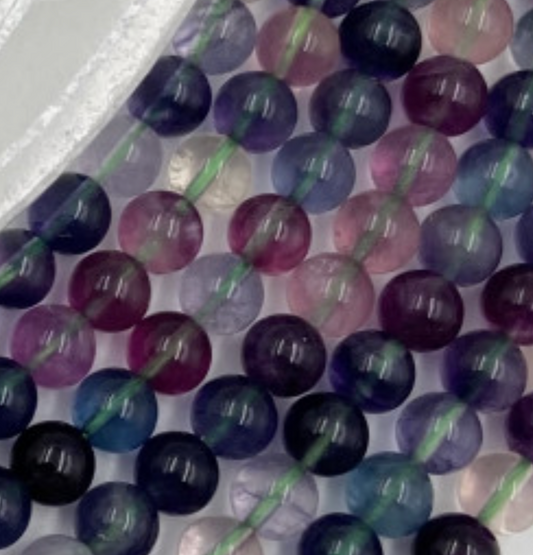 Fluorite multicolore qualité EXTRA, perles rondes 6 ou 8 mm, vendu : en fil de perle 38/39 cm, en bracelet de 17 à 21 cm, en collier de 45 ou sautoir de 60 cm. Qualité AAA !