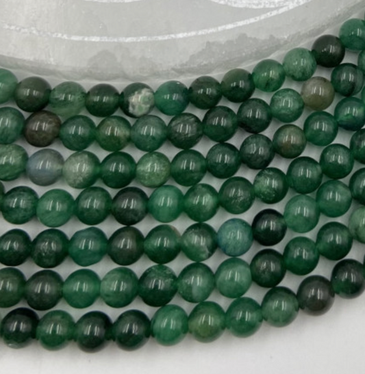 Fuchsite / Mica vert, perles rondes de 6 ou 8 mm. Vendu en fil de perle 38/39 cm, en bracelet de 17 à 21cm, en collier de 45 ou sautoir de 60cm. Qualité AA à AAA, superbes perles !