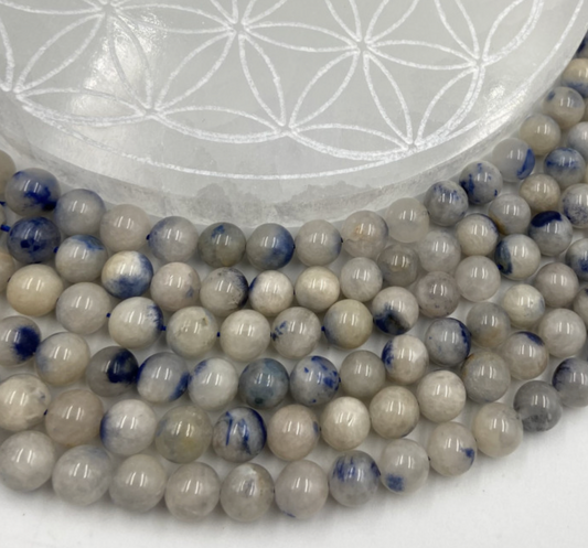 Dumortierite avec quartz, perles rondes de 6 ou 8 mm. Vendu en fil de perle 38/39 cm, en bracelet de 17 à 21cm, en collier de 45 ou sautoir de 60cm. Qualité AA à AAA !