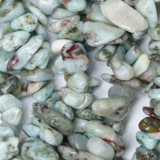 Larimar, bracelet de 17 à 21cm, collier de 42cm et sautoir de 60cm. Perles de type 'baroque/ chips' de formes naturelles montées sur fil élastique ou fil d'acier de haute résistance !