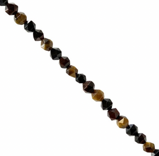 Perles 'Icosaèdres' de 6 millimètres en Oeil de tigre. Option de vente en : fil de perles 38/39 cm, en bracelet de 17 à 21cm, en collier de 45 ou sautoir de 60cm. Qualité AA à AAA, superbes perles !