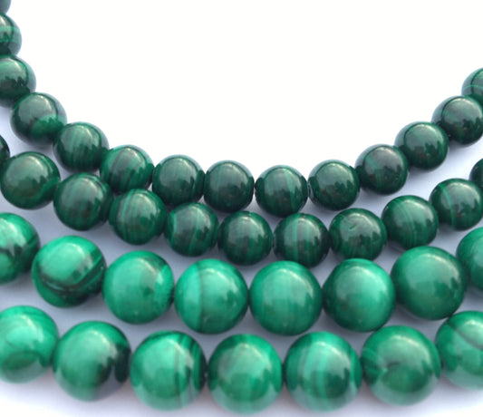 Malachite véritable, qualité Extra ! Perles rondes de 6 et 8 mm, vendu en fil de perle 38/39 cm, en bracelet de 17 à 21cm, en collier de 45 ou sautoir de 60cm. Qualité AA à AAA, superbes perles aux effets calmants !