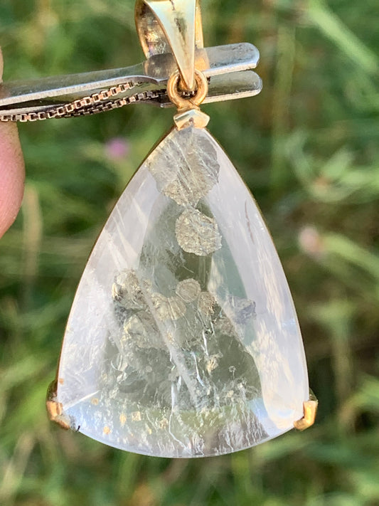 Cristal de roche/ Quartz Lodolite, quartz Chaman ou quartz jardin ! Pendentif en Argent, 36 mm de hauteur x 24 x 10 - 14,8 gr.. Vendu avec cordon réglable de couleur noire !