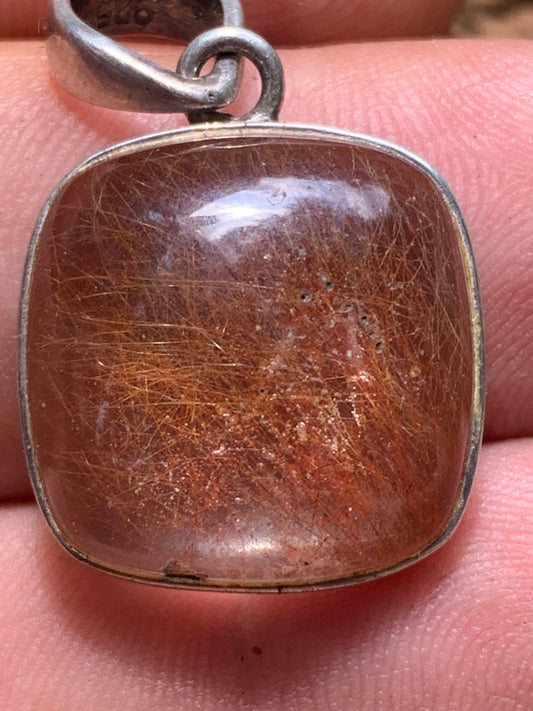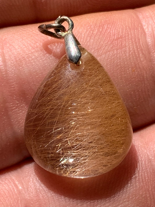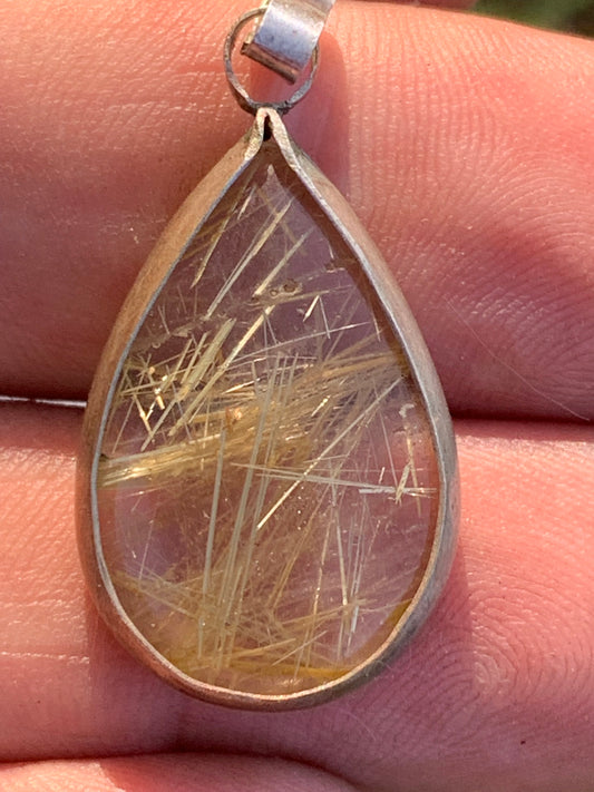 Cristal de roche/ quartz avec inclusions de rutiles dorés ! Pendentif en Argent, 33 mm de hauteur x 18 de largeur x 5 d'épaisseur. Vendu avec cordon réglable de couleur noire !
