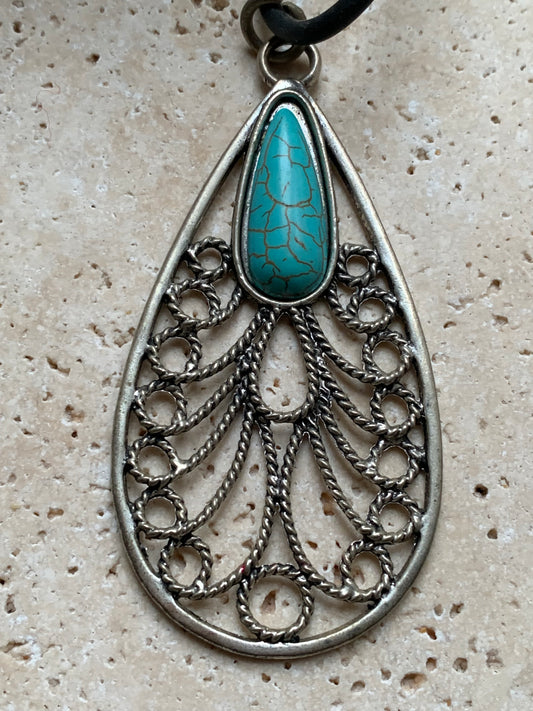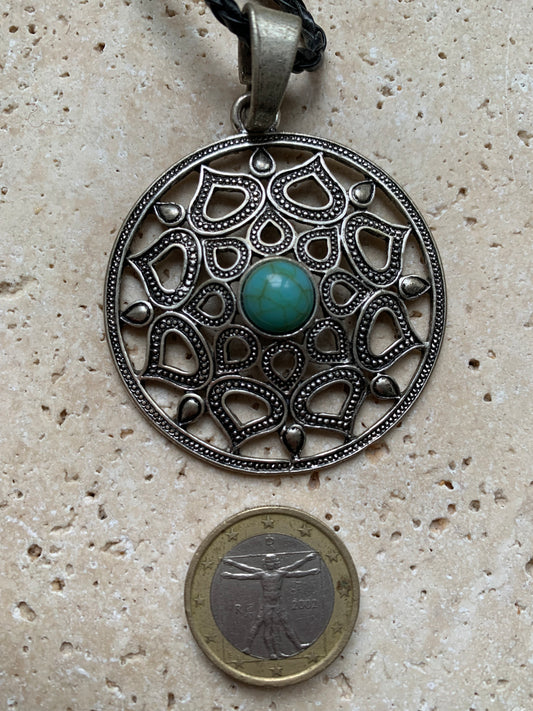 Pendentif en métal argenté en forme de Mandala avec cabochon d'howlite bleue au centre. De 80 millimètres de hauteur x 40 de largeur x 10 d'épaisseur. Vendu avec cordon noir réglable offert, parfait !