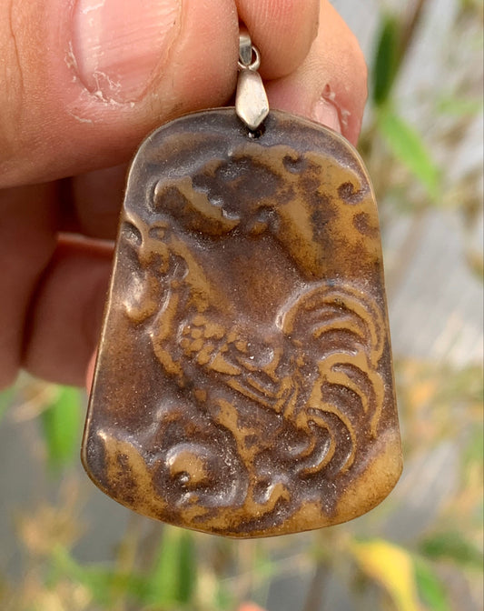 Jade néphrite, pendentif signe astrologique Chinois du Coq, 53 mm de hauteur x 32 de largeur x 6 d'épaisseur. Vendu avec cordon réglable de couleur noire.