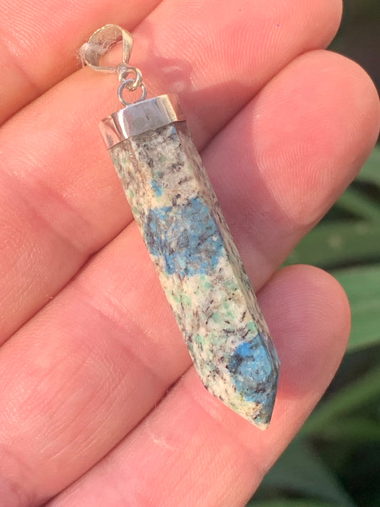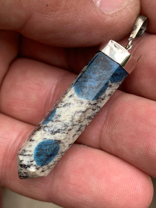 Jaspe K2* (Granit avec Azurite), pièce en Argent 0925 rhodié, de 58 millimètres de hauteur x 10 millimètres de largeur x 10 d'épaisseur. Vendu avec un cordon réglable de couleur noire !