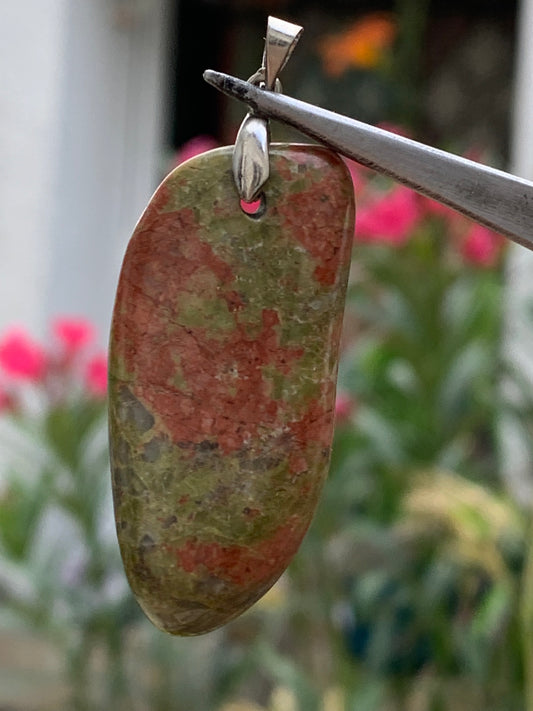 Jaspe unakite, monté par G & Z, de 50mm de ht x20 x10. Vendu avec un cordon réglable de couleur noire !