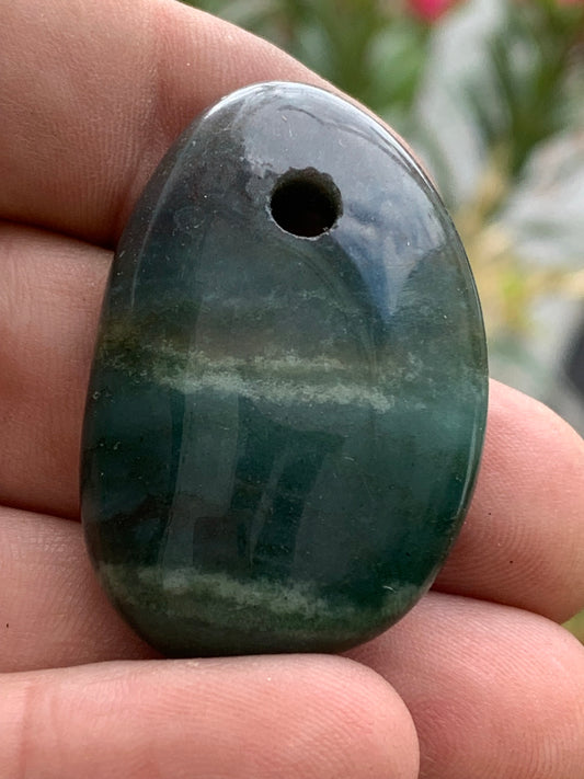 Jade, galet percé 43 mm de hauteur x 30 de largeur x 12 d'épaisseur. Vendu avec cordon réglable de couleur noire.