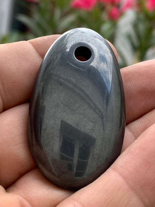 Hématite, pendentif en galet percé, de 50x30x5 millimètres, vendu avec cordon coulissant (réglable), en cuir noir de 40 à 70 centimètres !