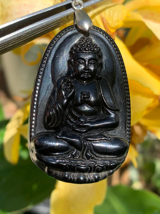 Obsidienne noire, pendentif du Bouddha de 62 millimètres de hauteur x 32 mm de largeur x 12 millimètres. Vendu avec cordon noir réglable offert !