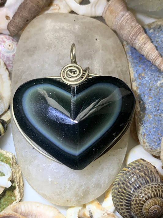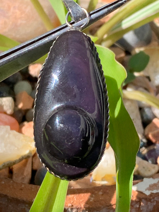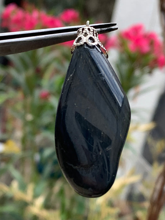 Obsidienne Oeil celeste, pendentif en Argent 925, de 37 millimètres de hauteur x 20 mm de largeur x 10 millimètres. Vendu avec cordon noir réglable offert !