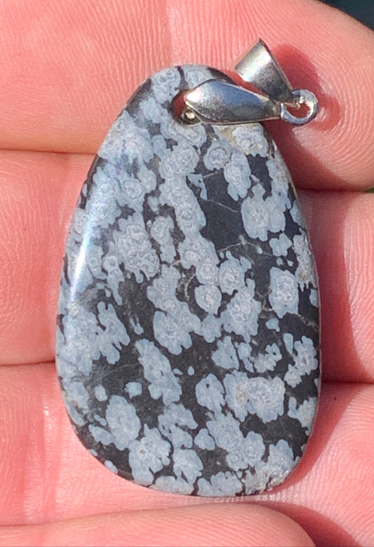 Obsidienne Neige, pendentif de 53 millimètres de hauteur x 25 mm de largeur x 5 millimètres. Vendu avec cordon noir réglable offert !