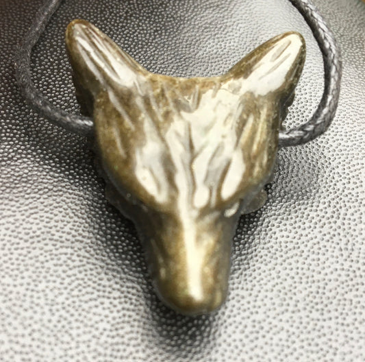 Obsidienne 'dorée', pendentif 'Tête de loup', de 38mm de hauteur x 30 de largeur x 15 d'épaisseur, fait en France. Vendu avec cordon réglable de couleur noire offert !