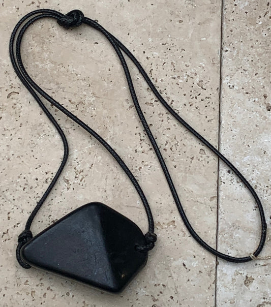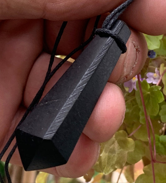 Shungite, pendentif taillé en pointe de 55 mm de hauteur x 13 de largeur x 13 d'épaisseur. Vendu avec son cordon réglable de couleur noire offert !