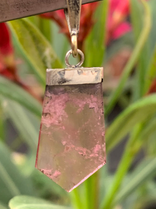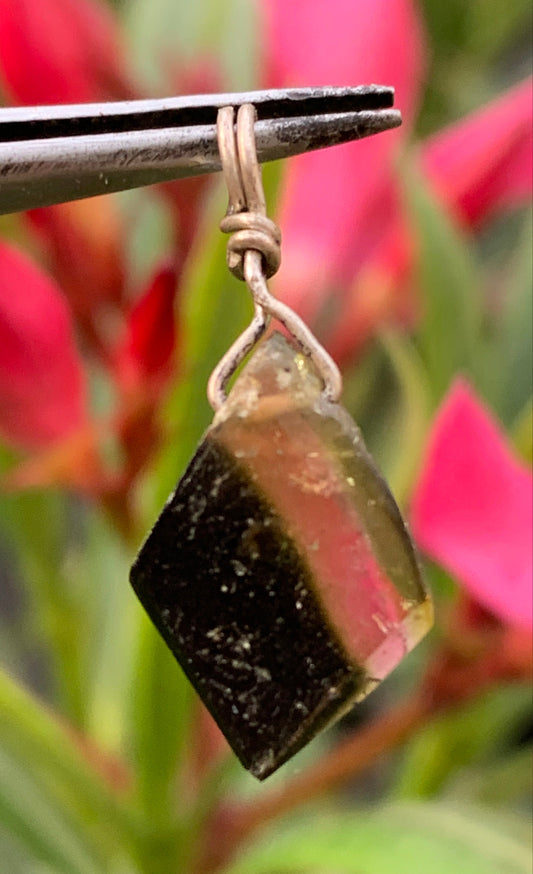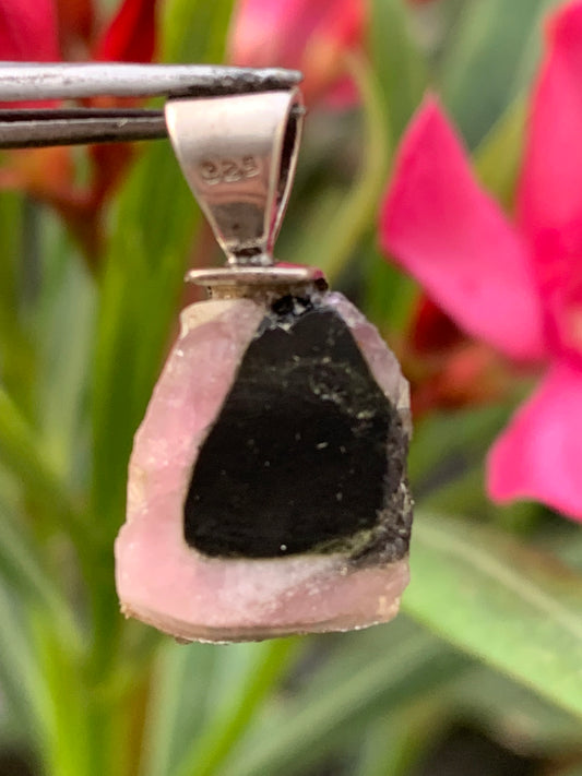 Tourmaline melon d'eau/ pastèque, pendentif en Argent fait par G & Z de 23 mm de hauteur x 12 de largeur x 6. Vendu avec cordon réglable de couleur noire !